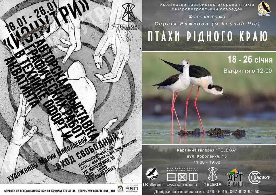 В галерее Телега две новые выставки: авторская графика в технике офорт и акватинта Марии Николаевой "Изнутри" и фото Сергея Рыжкова (Кривой Рог) "Птицы родного края".